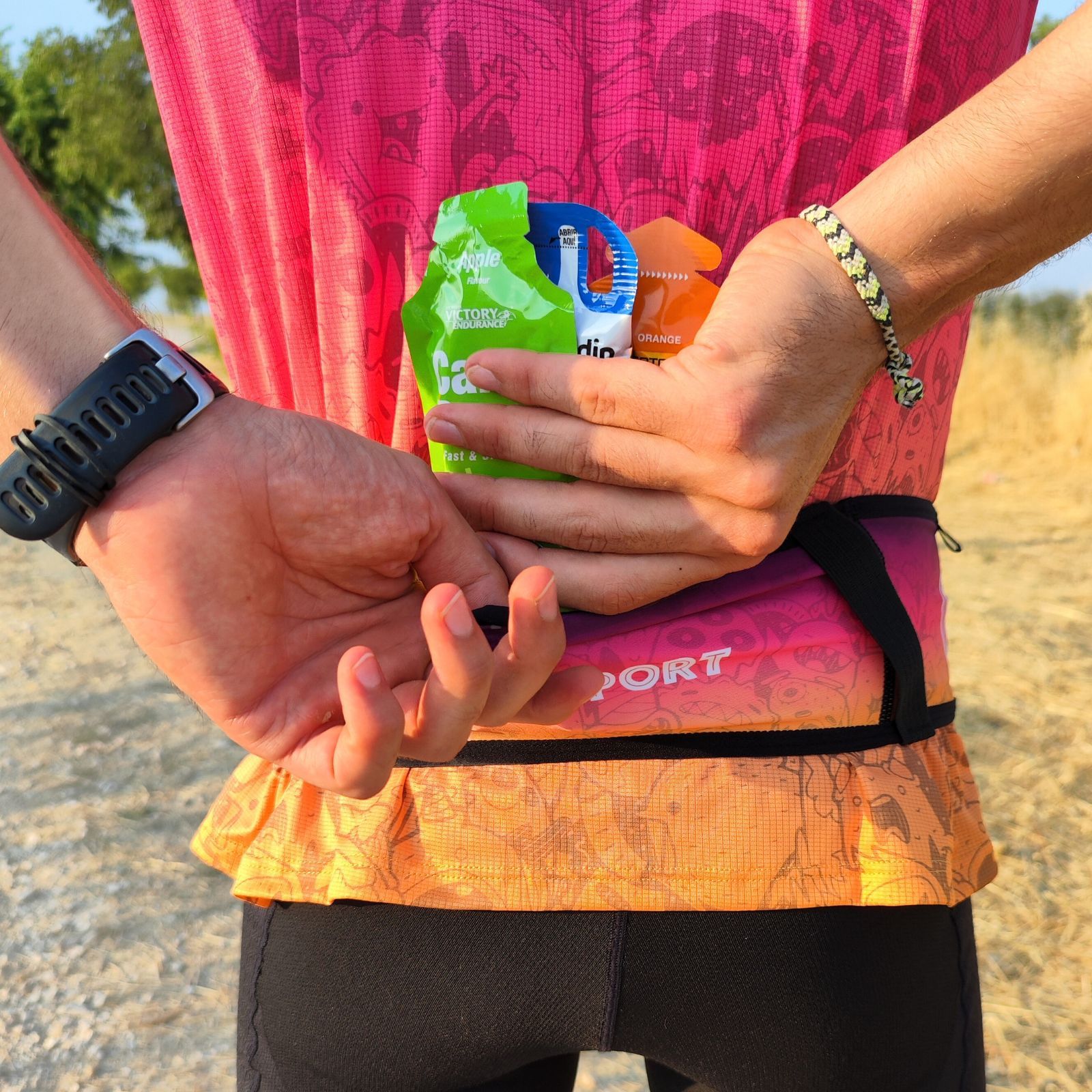- 4 bolsillos: bolsillo trasero grande semicerrado para no perder nuestros objetos y con capacidad para llevar un soft flask o botella de hasta 0.5 litros. 2 bolsillos laterales para llevar geles, barritas, llaves, manta térmica, etc., 1 bolsillo grande delantero para llevar el móvil, cortavientos, GoPro.