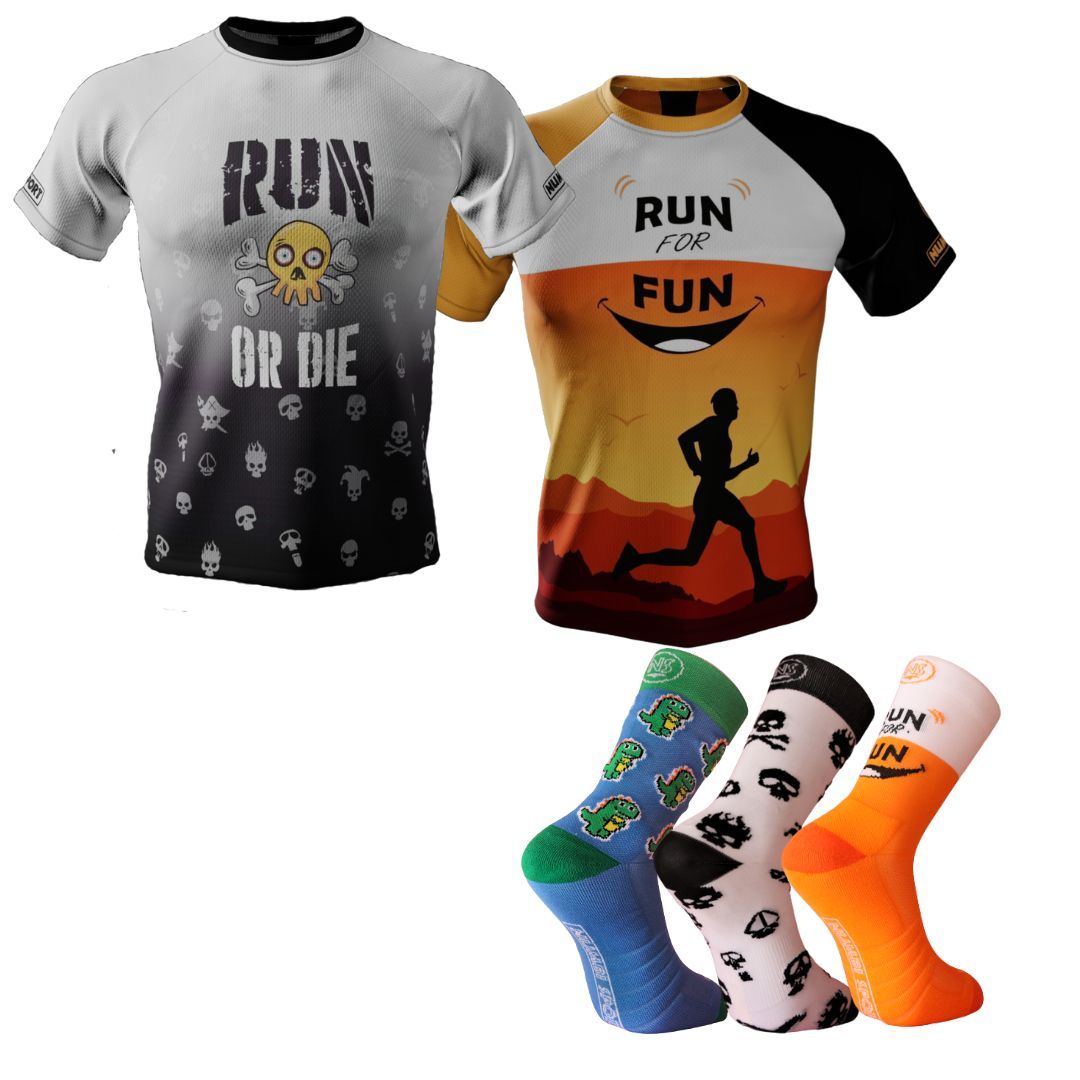 Pack running hombre de ropa deportiva compuesto por 2 camisetas running y 3 pares de calcetines deportivos